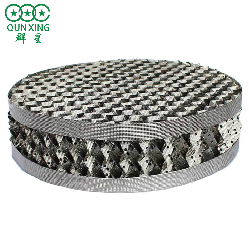 金屬填料適用于真空精餾塔,處理G敏性、易分解、易緊合、易結(jié)碳的物料,金屬填料廣泛用于石化、化肥、化工、H保等行業(yè)的填料塔中。金屬填料分為金屬散堆填料(鮑爾環(huán)、矩鞍環(huán)、階梯環(huán)、共軛環(huán)、八四內(nèi)弧環(huán)、扁環(huán)等)和金屬規(guī)整填料(金屬絲網(wǎng)波紋填料、金屬孔板波紋填料、壓延刺孔板波紋填料、金屬網(wǎng)板波紋填料、HT 半管式規(guī)整填料)。金屬填料的優(yōu)缺點(diǎn)都非常明顯,其優(yōu)點(diǎn)在于其可以加工成各種幾何形狀結(jié)構(gòu)的填料、良好的潤(rùn)濕性、耐高溫性、壓降小、金屬填料裝塔時(shí)不會(huì)破碎、便于裝卸和清理;由于其強(qiáng)度高,彈性模量大,因而可以使填料的壁厚加工的很薄:若制備成波紋填料,其板的厚度一般在01~15mm;而若制備成絲網(wǎng)波紋填料,國(guó)外不銹鋼絲直徑一般為016mm左右,國(guó)內(nèi)絲網(wǎng)規(guī)格不一,通常在01到025mm之間。但是金屬填料缺點(diǎn)是制造價(jià)格貴、加工成本高,雖說(shuō)一次性投資稍大,但卻能發(fā)揮塔設(shè)備的潛在力;此外金屬填料成型工藝復(fù)雜、耐各類酸堿溶液的腐蝕性較差、使用壽命較短,一般在兩年左右。金屬填料可用多種不同的金屬材質(zhì)加工制備,一般而言,金屬填料可根據(jù)實(shí)際應(yīng)用的需要可選用不銹鋼、碳鋼、C4鎳基合金、蒙乃爾合金、鋁、青銅、鎳、鈦等金屬作為基質(zhì)制備加工填料。對(duì)不同材質(zhì)選擇時(shí)主要考慮其耐腐蝕性的問(wèn)題,碳鋼材質(zhì)填料造價(jià)低,且具有良好的表面潤(rùn)濕性能,對(duì)于無(wú)腐蝕或腐蝕性比較低的物系,一般給與優(yōu)先考慮使用;不銹鋼填料耐腐蝕性較強(qiáng),一般能夠耐除C1以外常見物系的腐蝕,但其造價(jià)成本較高,并且表面潤(rùn)濕性能相對(duì)較差,除了在某些特殊的應(yīng)用場(chǎng)合(如極低噴淋密度下的減壓精餾過(guò)程)才考慮使用,使用前通常需要對(duì)其表面進(jìn)行處理,以提高其表面的潤(rùn)濕性,這樣不銹鋼填料才能取得良好的使用效果;對(duì)于鈦材、特種合金鋼等材質(zhì)制成的填料由于造價(jià)很高,一般在某些腐蝕性極強(qiáng)的物系下使用,使用范圍很有限。圖12為金屬散堆填料和金屬規(guī)整填料實(shí)物圖。